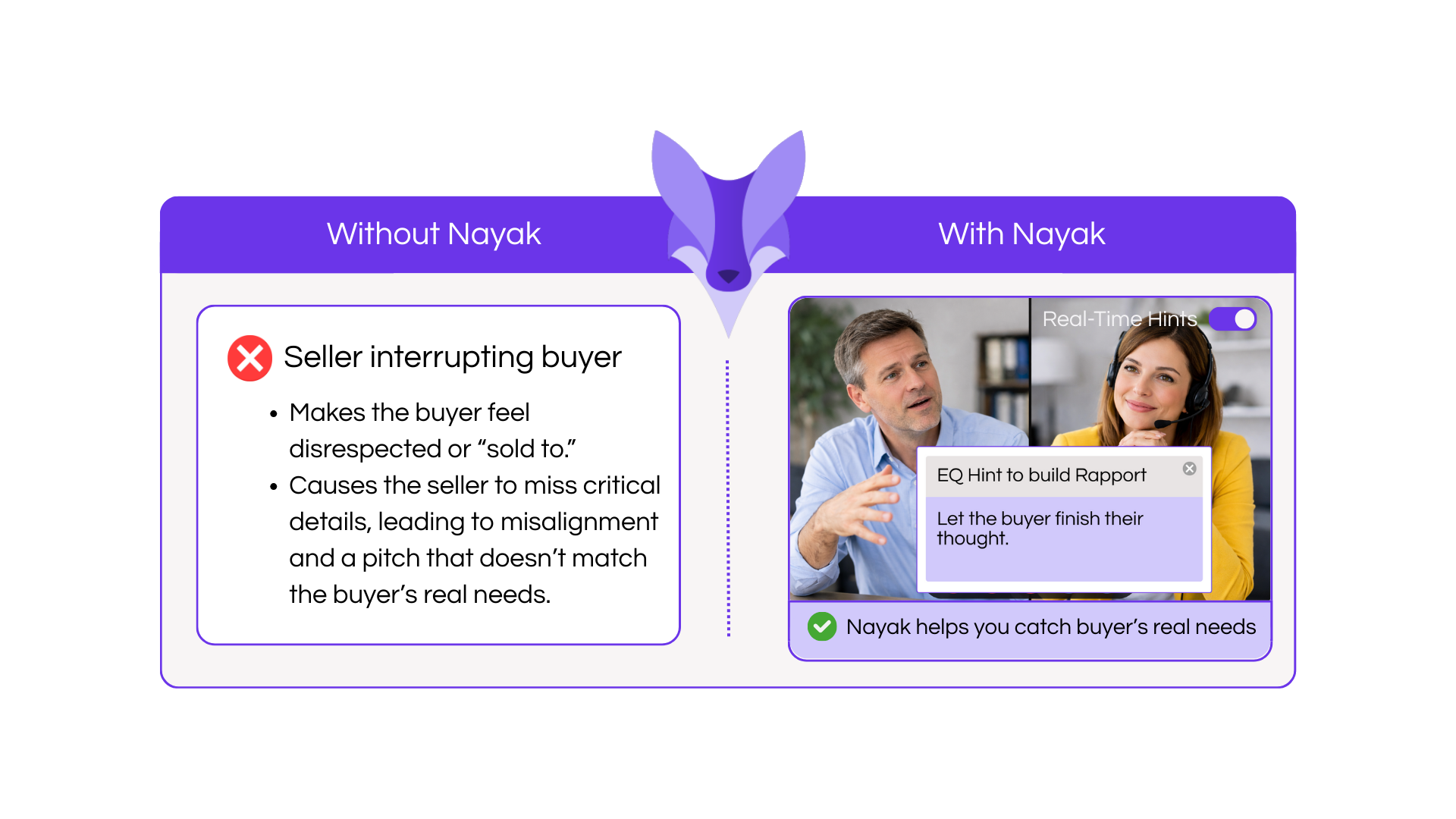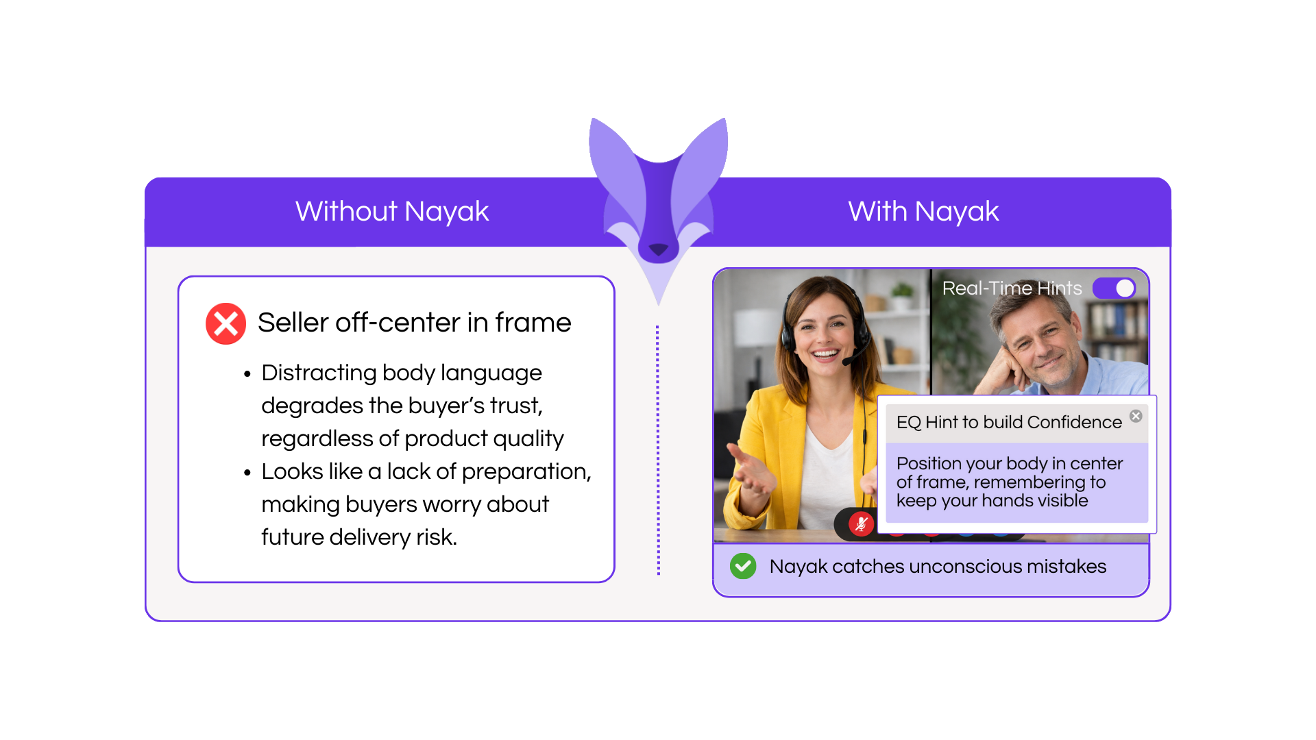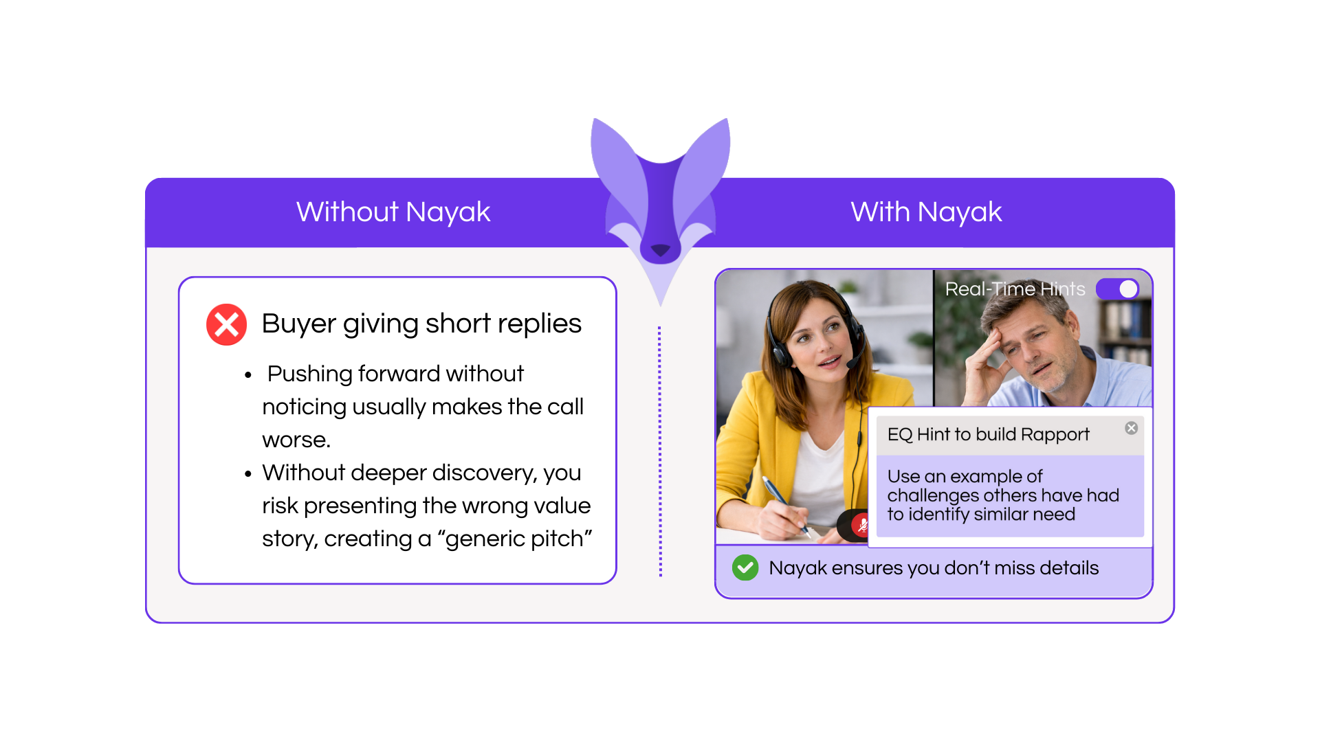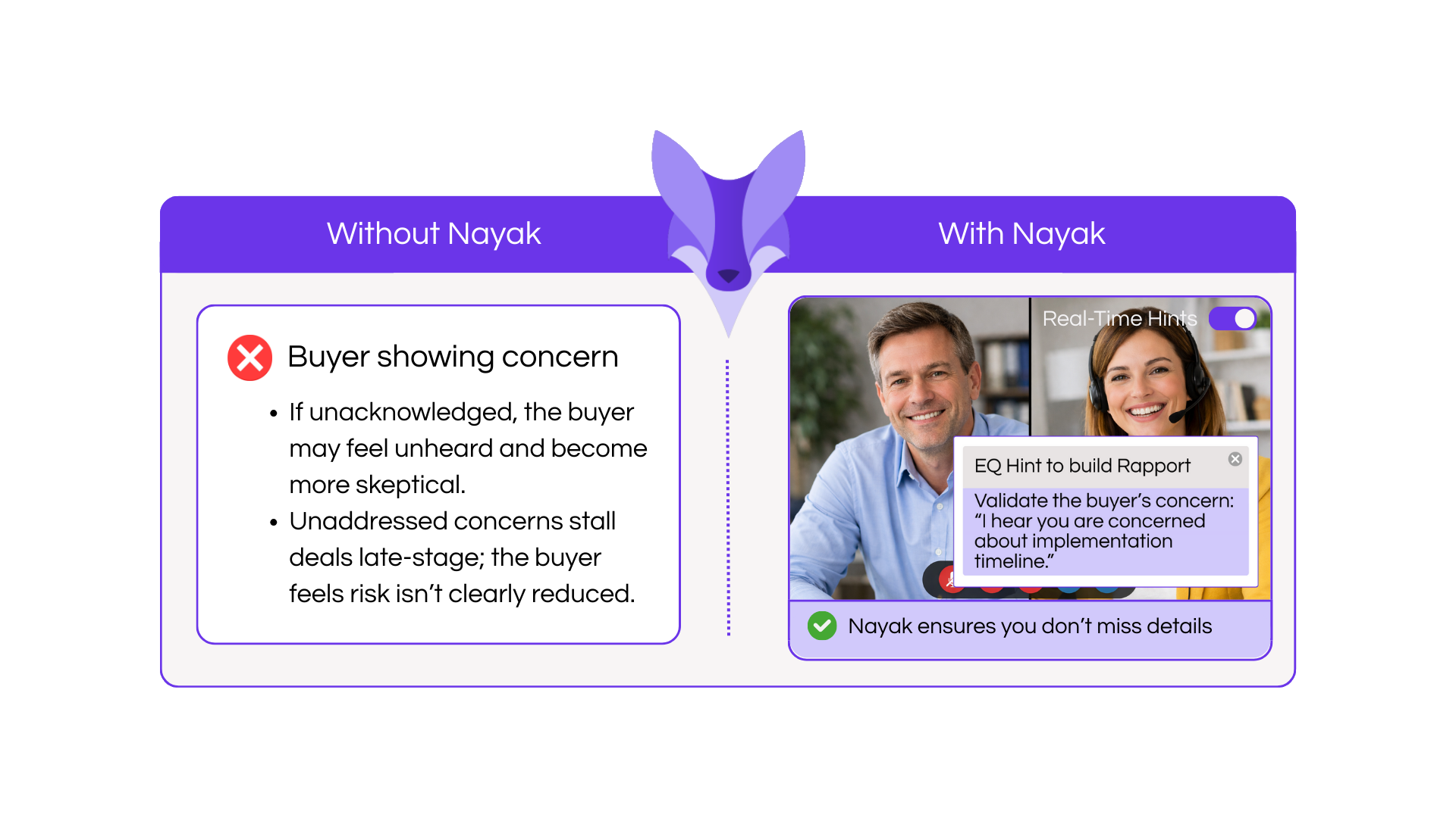 During live video calls, Nayak's Trust Index analyzes conversations in real time and recommends specific actions to strengthen trust and deepen relationships. When rapport begins to slip or confidence wavers, instant prompts guide you through the moment with actionable suggestions.